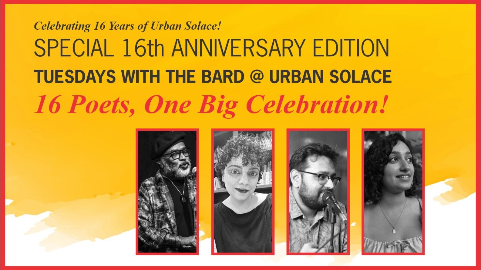 SPECIAL EDITION ON THE OCCASION OF THE 16TH ANNIVERSARY OF URBAN SOLACE COMPRISING A 4-PART SPECIAL OF POETRY FROM THE HEART WITH 5 POETS IN EACH EDITION, MAKING IT A GRAND EXPERIENCE OF THE VERY BEST POETS IN BANGALORE, MAKING IT 16 POETS FOR OUR 16TH ANNIVERSARY.