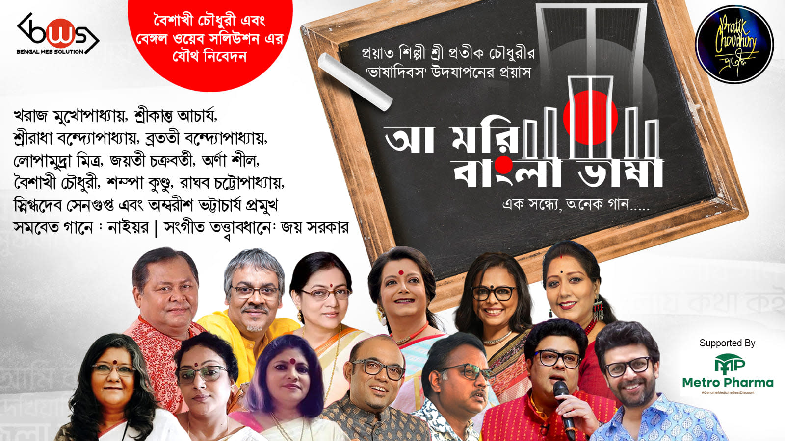 Featuring an eminent lineup including Baisakhi Chowdhury, Kharaj Mukhopadhyay, Srikanto Acharya, Sreeradha Bandyopadhyay, Bratati Bandyopadhyay, Lopamudra Mitra, Jayati Chakraborty, Arna Seal, Shampa Kundu, Raghab Chattopadhyay, Snigdhadeb Sengupta, and Ambarish Bhattacharyya, with chorus performances by Naiyor, the evening brings together songs, recitations, and spoken word in tribute to Bangla bhasha.