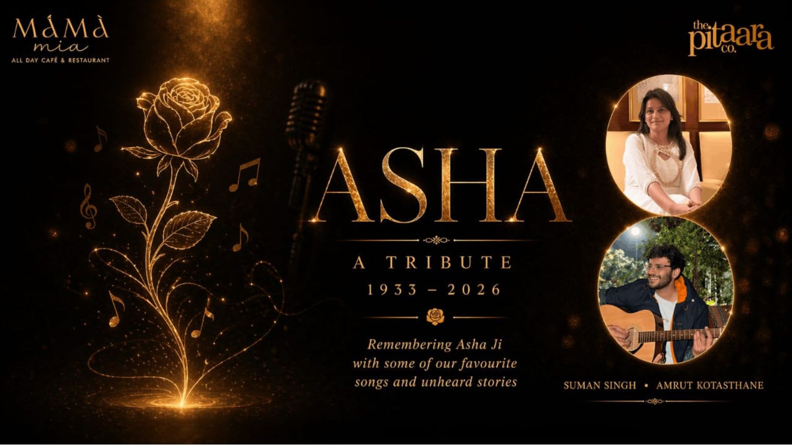 An intimate musical evening celebrating the timeless legacy of Asha Bhosle. Through iconic songs, rare gems, and short stories from her life, the show traces her journey across decades. She may not be with us today, but her voice continues to define an era.