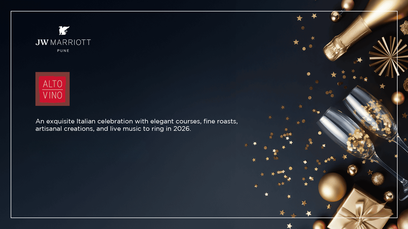 Welcome 2026 with curated experiences across JW Marriott Pune—from gourmet dinners and crafted cocktails to music and a night of flavors, rhythm, and celebration. Ring in the New Year your way with our exclusive set menu.