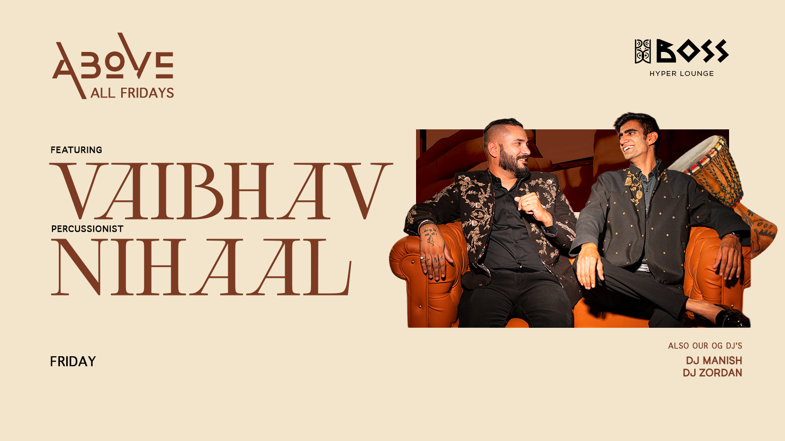 Turn your Friday Above All at Boss Hyperlounge as Resident DJ Vaibhav takes over the decks with Commercial, Bollywood, Hip-Hop & House hits. Experience the night come alive with Percussionist Nihaal’s high-energy live performance, adding powerful rhythmic beats to the dancefloor.