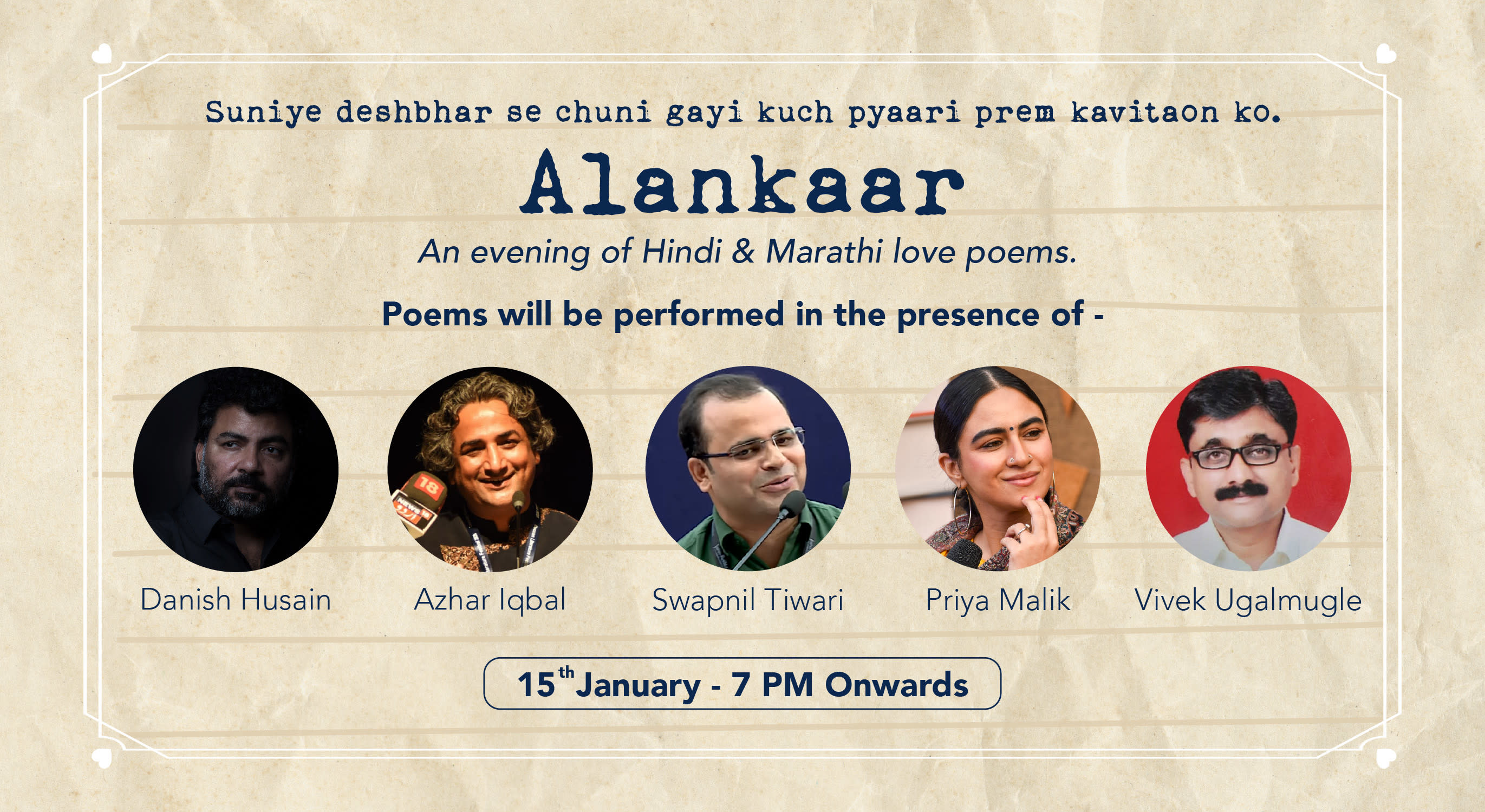 "Alankaar: Ek manch prem kavitaon ka." is an evening of Love poems of all kinds. We have brought to you some of the most amazing Hindi and Marathi poets from across India with their beautifully written and soulfully crafted love poems.