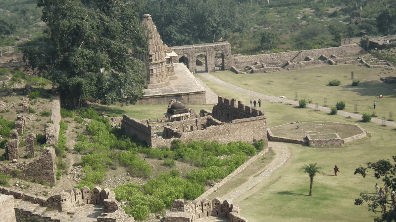 Hilltop fort ruins, temples, palaces, and forested surroundings.