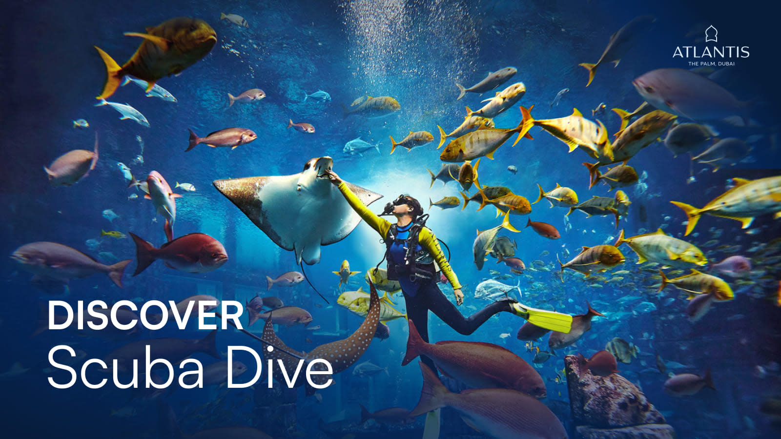Descend into the world-famous ambassador lagoon for the unique opportunity to engage with up to 14 different species of sharks and rays amongst 65,000 marine animals. The Lost Chambers offers the Atlantis Dive Discovery, whereby non-certified divers can dive in our largest open-air marine habitat, the Ambassador Lagoon, located in Atlantis the Palm. They are led by our dive leader and safety diver for a one-of-a-kind dive experience.