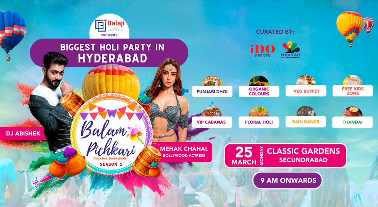 Balam Pichkari 2024, Season 5 is organised by Navkar Entertainments & I Do events, with famous celebrity- MAHEK CHAHAL & DJ ABISHEK RUPAREL, the ultimate entertainment, live dhol, organic colours, Yummy food & much more.
