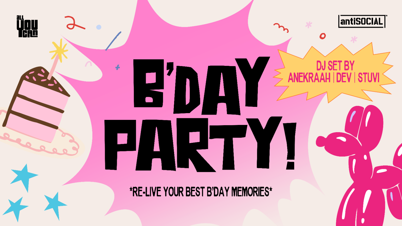 AYC B'day Party is the best way to re-live your childhood, for one night through classic games, activities like magic shows, temporary tattoos and a room full of balloons!