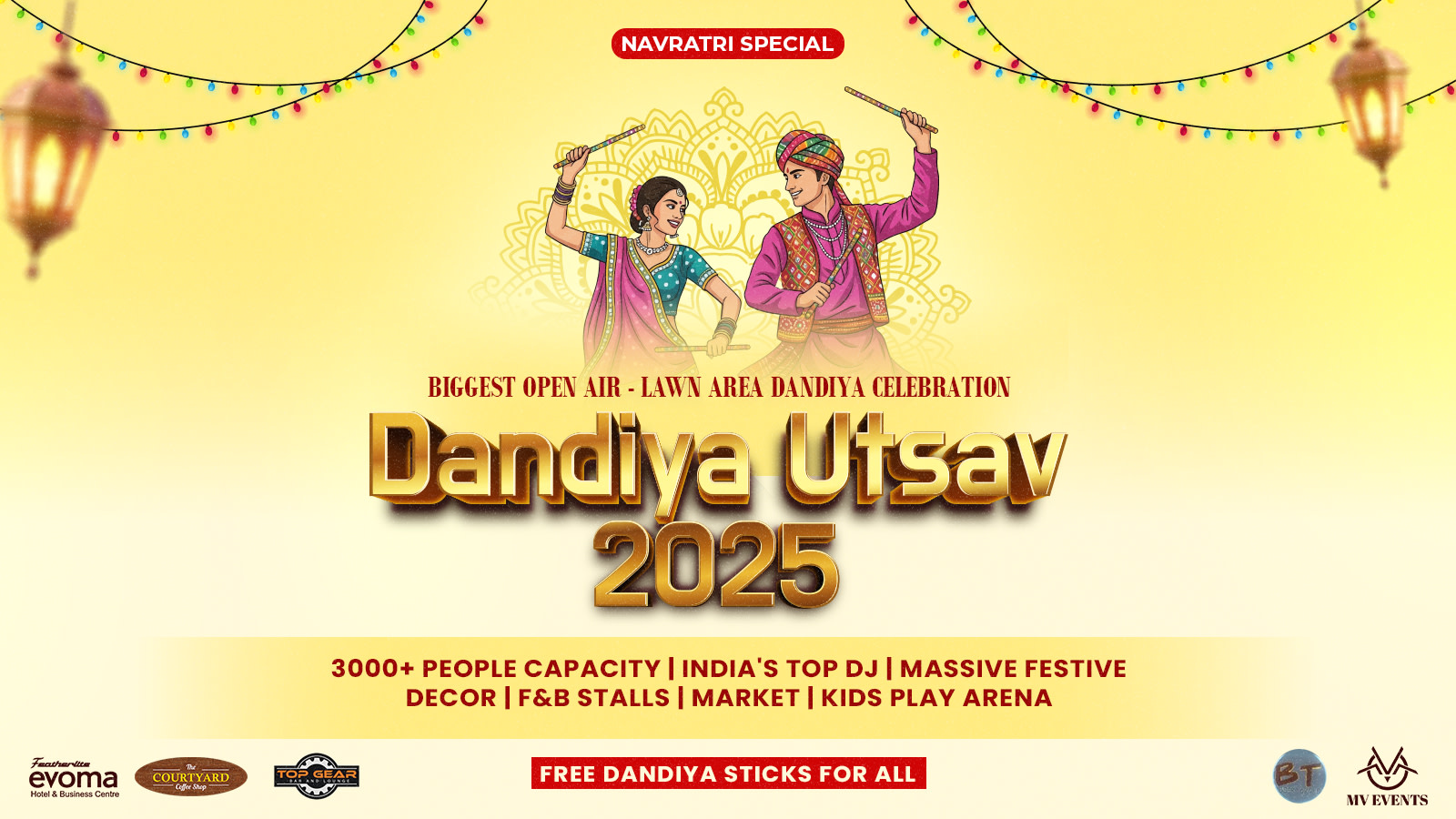 ๐ Free Dandiya Sticks: No need to bring your own! We provide free dandiya sticks to all attendees, so you can join the dance floor and show off your best moves.