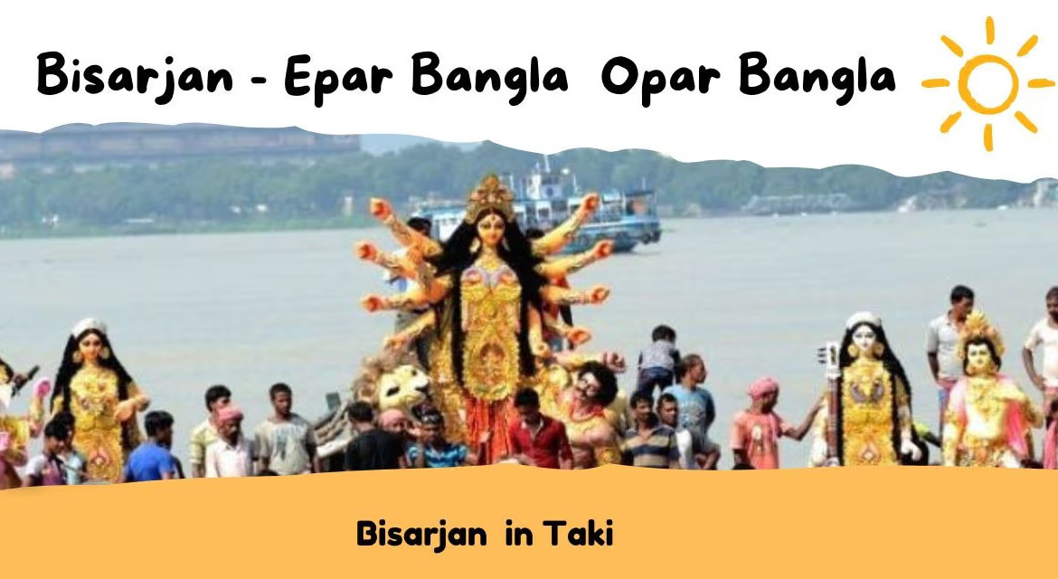 Immersion is one of the rituals of Durga Puja.Thousand of Durga Idol was immerse in Ganges and other river in Bengal.But very few people know that our neighbouring country Bangladesh will also celebrate Durga Puja every year. Taki ,a small border town in 24 Pargaana, will witness this event every year .Ichamoti river which divides Bharat and Bangladesh, many of Durga idol will immerse in this river.From Taki you can see the opar Bangla Durga Bisarjan.