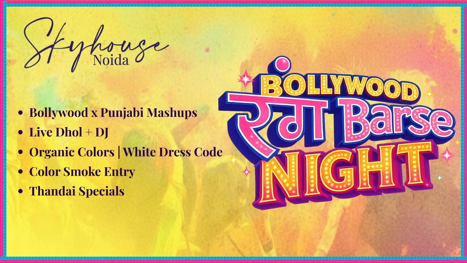 This Holi, we’re turning up the heat with Bollywood x Punjabi mashups, electrifying Live DJ + Dhol, and a high-energy festive vibe that will keep you dancing all night long.