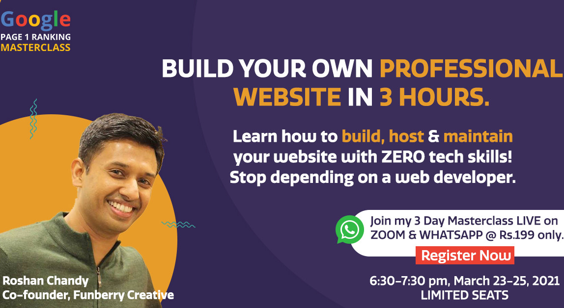 LEARN TO BUILD, MAINTAIN AND HOST YOUR OWN WORDPRESS WEBSITE IN 3 HOURS WITH ZERO TECH SKILLS. THE REGULAR PRICE FOR THIS COURSE IS RS 1,999/- BUT YOU CAN GET THIS FOR RS 199/- IF YOU REGISTER NOW. OVER 35% OF ALL WEBSITES WORLDWIDE USE WORDPRESS. TAKE THIS ONCE IN A LIFETIME OPPORTUNITY AND SIGN UP NOW FOR THIS MASTERCLASS. YOU WILL NO LONGER HAVE TO DEPEND ON COSTLY WEB DEVELOPERS.