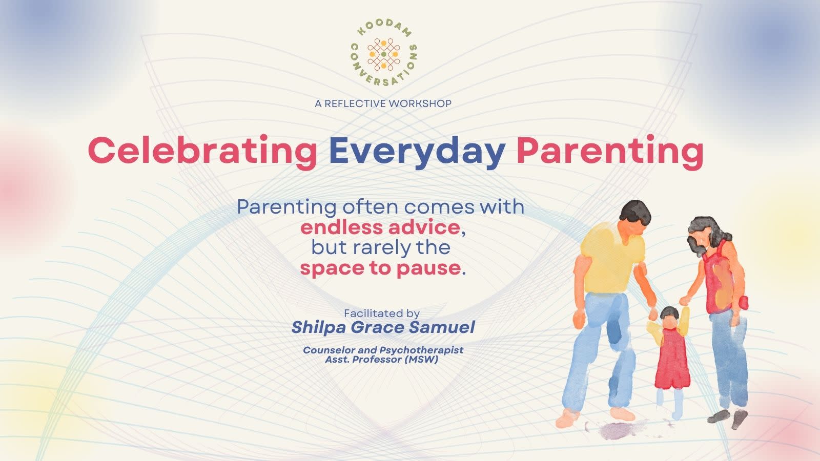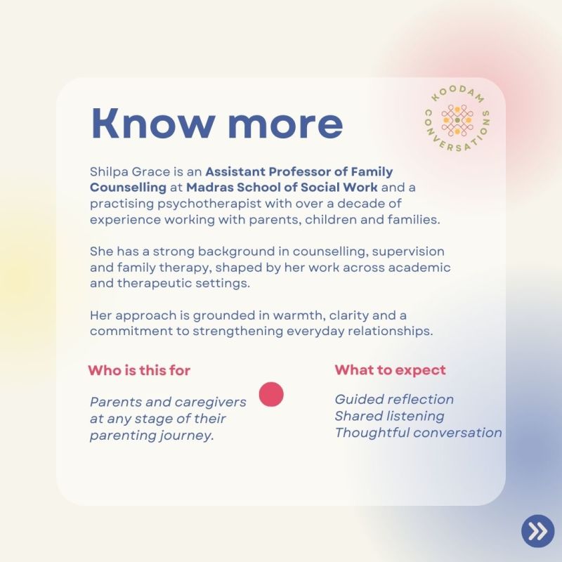Led by Shilpa Grace Samuel, Counselor and Psychotherapist, and Assistant Professor of Family Counselling at Madras School of Social Work, who has over a decade of experience working with parents, children, and families. Her approach is grounded in warmth, clarity, and everyday relational practice.