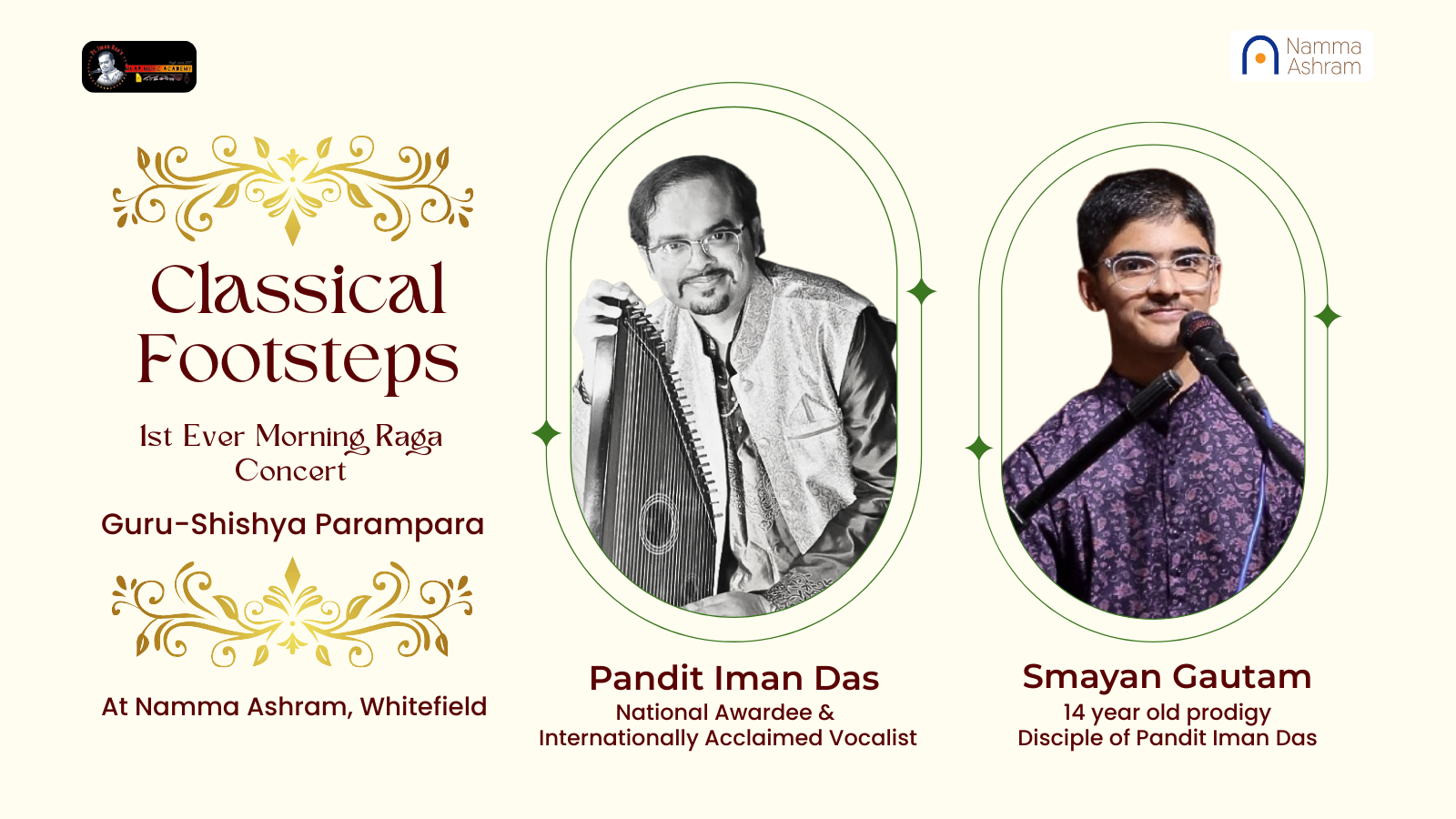 Conceived by National Awardee and internationally acclaimed Classical Vocalist and maestro Pandit Iman Das, with him and his young disciple,14 year old prodigy Smayan Gautam, [one of his leading disciples of Pt. Iman Das's celebrated Omkar Music Academy] will be presenting to you a musical phenomenon never experienced before at Namma Ashram.