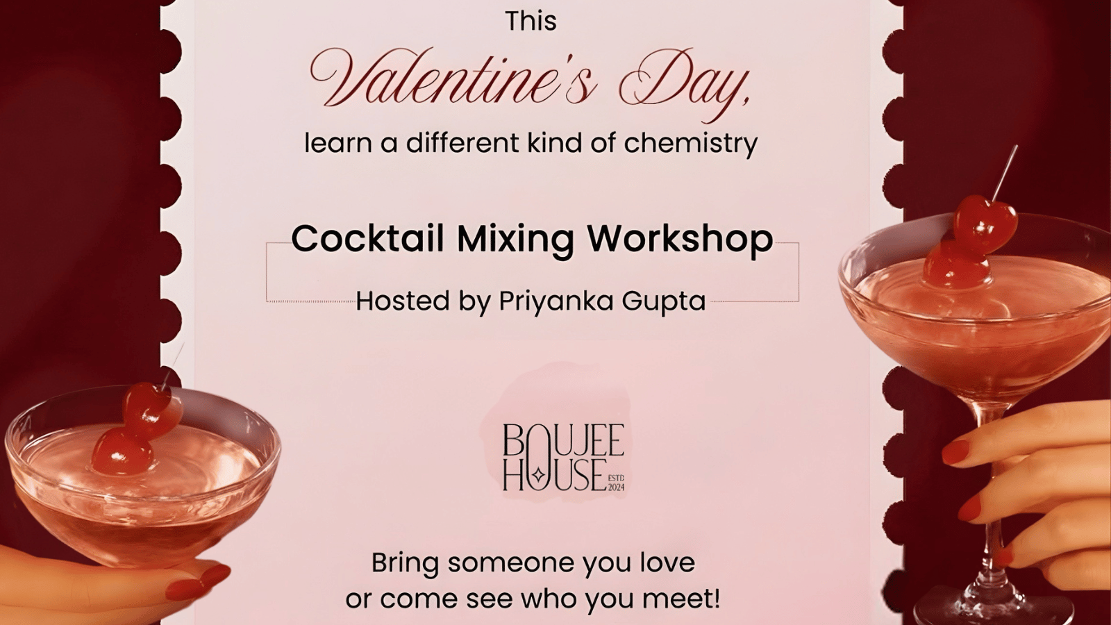Join us for an exclusive Cocktail Mixing Workshop hosted by Priyanka Gupta, where you’ll learn the art of crafting perfectly balanced, romance-inspired cocktails. From shaking and stirring to garnishing like a pro, discover the secrets behind creating drinks that spark conversation and connection.