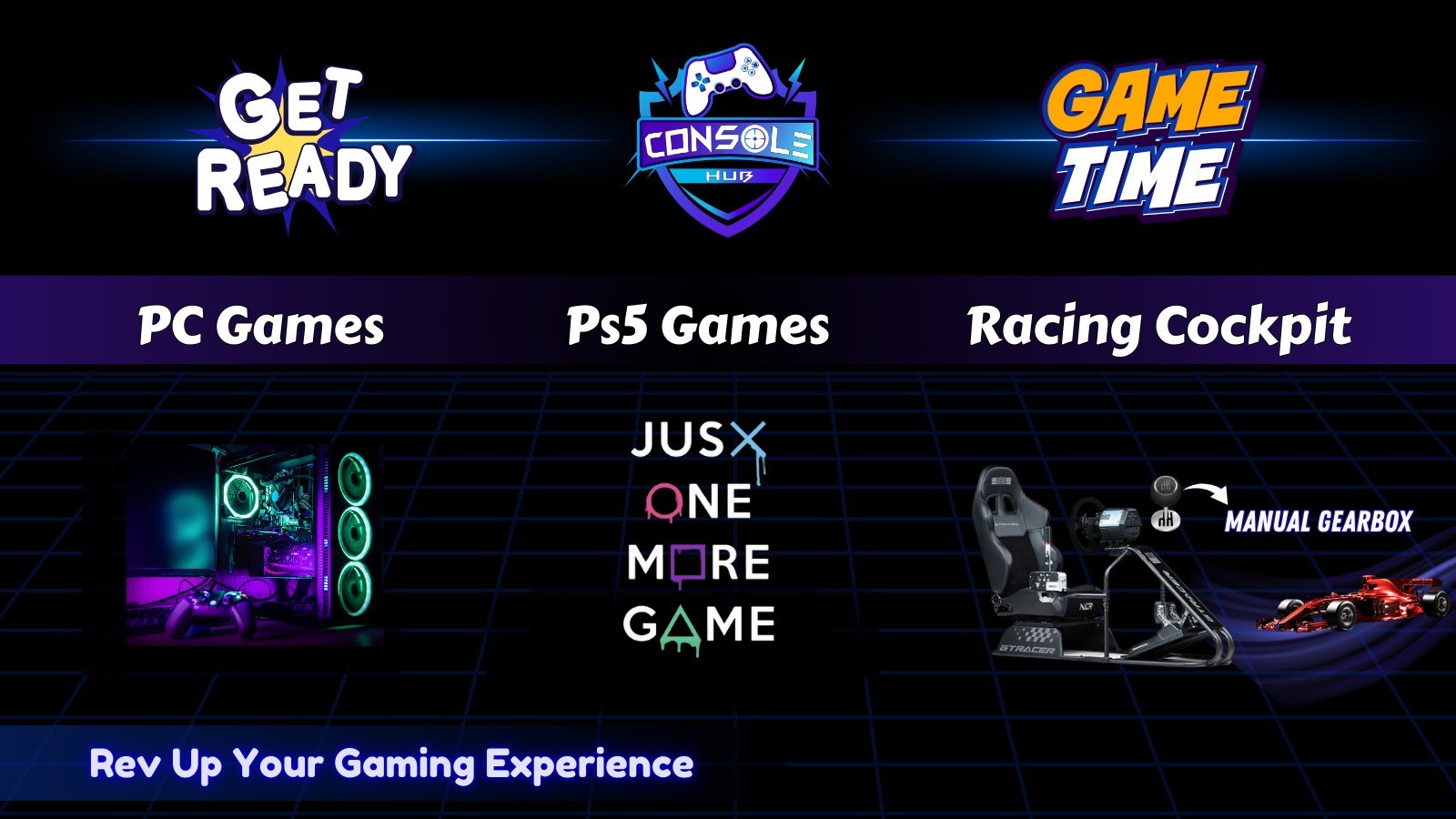 Step into Console Hub, Ahmedabad’s premium gaming lounge for PC Games, PS5 Games, and a realistic Racing Cockpit with manual gearbox. Powered by high-performance systems, lightning-fast internet, and top-quality gaming gear, we bring you the ultimate esports and casual gaming experience.
