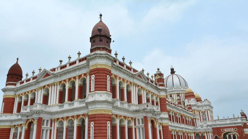 Built in red brick, the structure features turrets, spires and pilasters with terracotta mouldings, while the grand iron dome rises 120 feet above the Durbar Hall. Breezy verandas and English style interiors enhance its stately character.