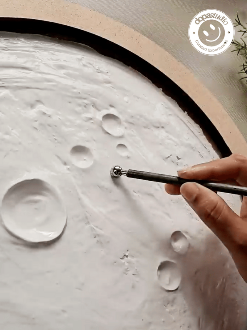 The Workshop: You’ll begin with a round MDF board fitted with LED strip lights along its edges, the base of your moon lamp. First, paint the surface and sides black to form a dramatic night-sky backdrop. Then, layer kneaded wall putty across the board with your hands, creating the base of the moon’s surface. Wearing gloves, you’ll pat and shape the semi-wet putty to build texture, and press with the edges of disposable cups to form realistic craters. More putty is added to refine the look, revealing a beautifully rugged lunar landscape that glows once illuminated.