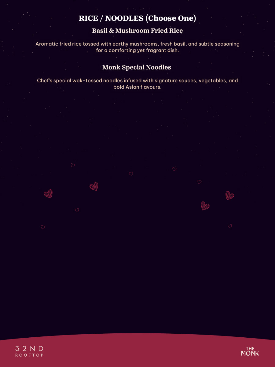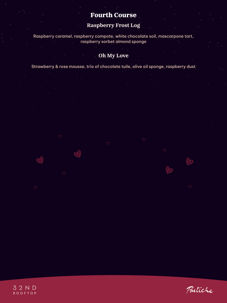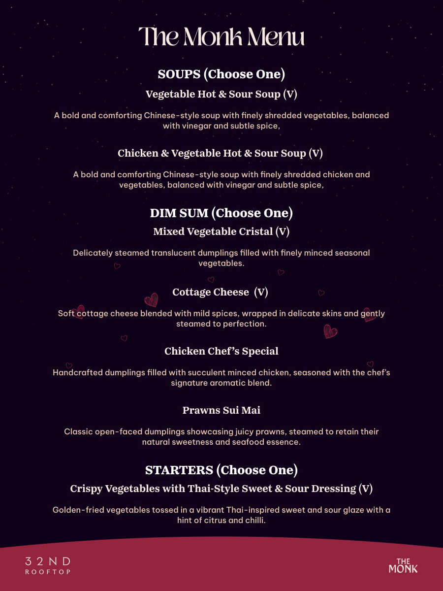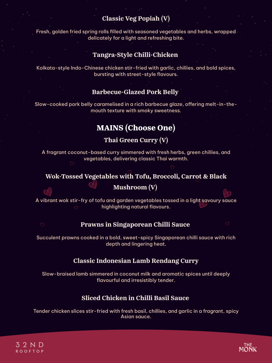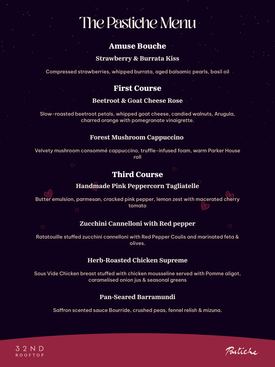 Celebrate love under the stars with an intimate Valentine’s rooftop experience. Indulge in a specially crafted chef’s menu for the evening, paired with thoughtfully curated flavours and drinks. The food menu is brought to you by The Monk & Pastiche at the 32nd rooftop.