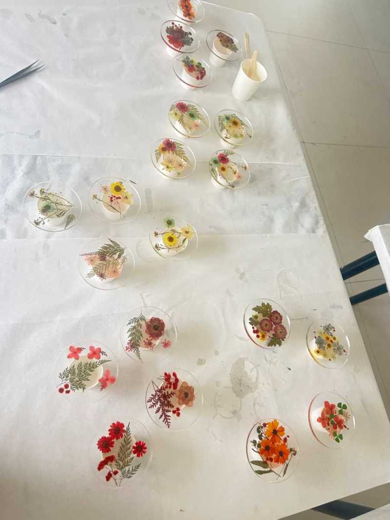 Materials Provided- 4 sets of round / hexagon or both-shaped coaster bases, resin, dried pressed flowers and hardener, pigments, a carry box, a hot air gun, cups, and sticks to mix resin and gloves.