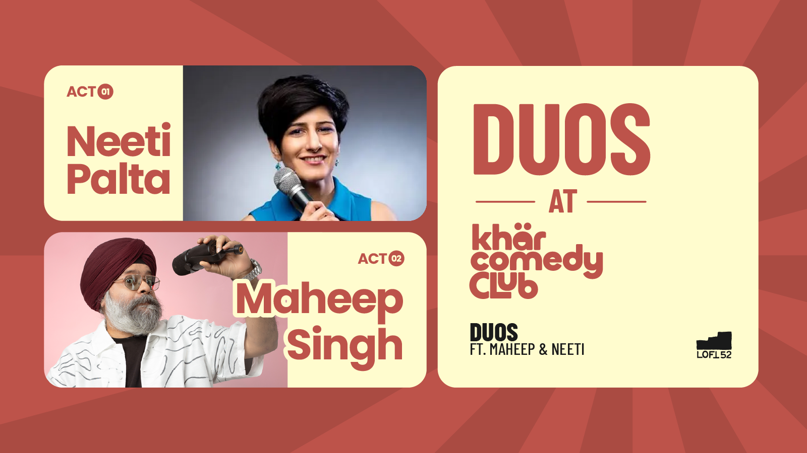 Two powerhouse comics, Neeti Palta and Maheep Singh, come together for a special DUOS show at Khar Comedy Club. Expect sharp observations, witty storytelling, and the unique comedic styles of both artists as they share the stage for an evening full of big laughs and unforgettable moments.