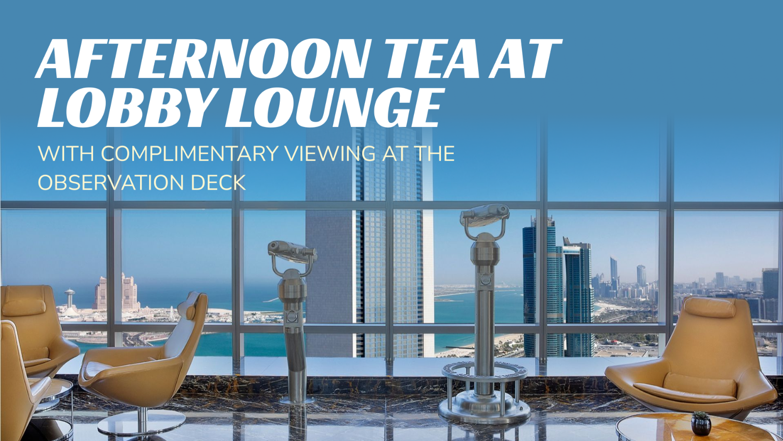 Afternoon Tea will be served in the Lobby Lounge followed by complementary viewing on the 'Observation Deck at 300.' The Viewing experience is located in Etihad Towers' second tower, on level 74 of Conrad Abu Dhabi Etihad Towers, The Observation Deck at 300 is the highest vantage point in Abu Dhabi. The guest will have the Afternoon Tea experience at the Lobby Lounge, located on the ground floor of the Hotel Lobby. The guests can enjoy a selection of tea, coffee, snacks and our exclusive afternoon tea.
