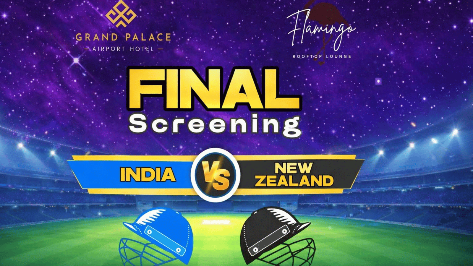 Join us at Flamingo Rooftop Lounge, Grand Palace Airport Hotel for an electrifying Final Screening of India vs New Zealand. Experience every thrilling moment of the match live on big screens while soaking in the vibrant rooftop atmosphere, great food, and refreshing drinks.