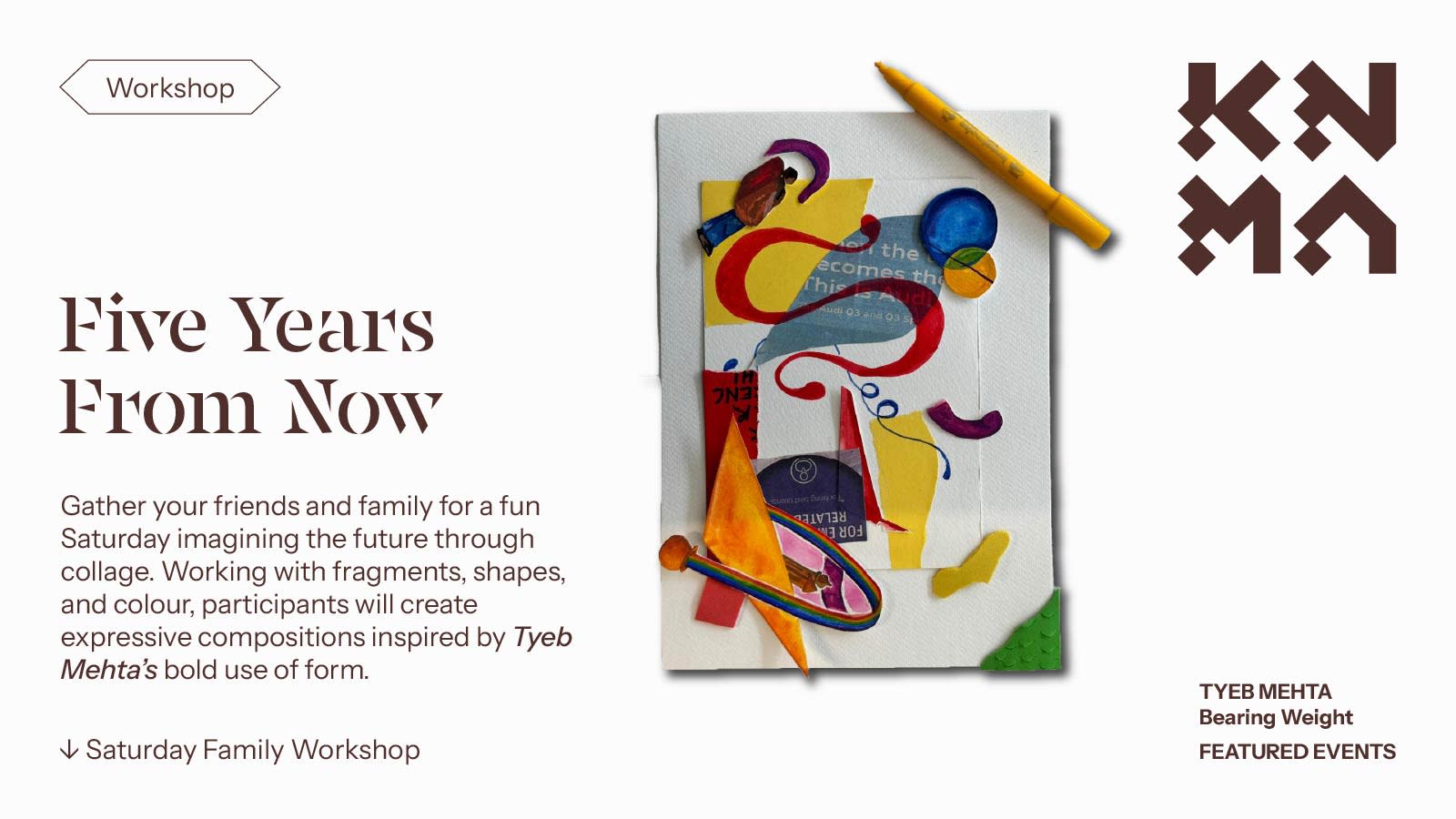 Five Years From Now is a collage-based Saturday Family Workshop that invites participants to imagine the future through feeling, intuition, and visual exploration rather than fixed plans. Inspired by the artistic language of Tyeb Mehta, whose paintings transform fragments, divisions, and simplified forms into powerful emotional images, this workshop encourages families to think about how inner experiences can be expressed through shape, colour, and composition.