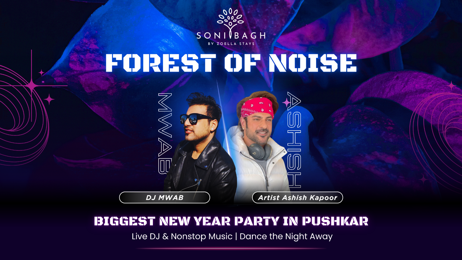 Celebrate New Year’s Eve at Forest of Noise, Sonibagh’s signature open-air party experience and one of Pushkar’s most anticipated New Year celebrations. Crafted as a premium, ticket-only event, Forest of Noise is designed for guests seeking a high-energy yet refined New Year’s Eve in a well-managed, luxury outdoor setting.