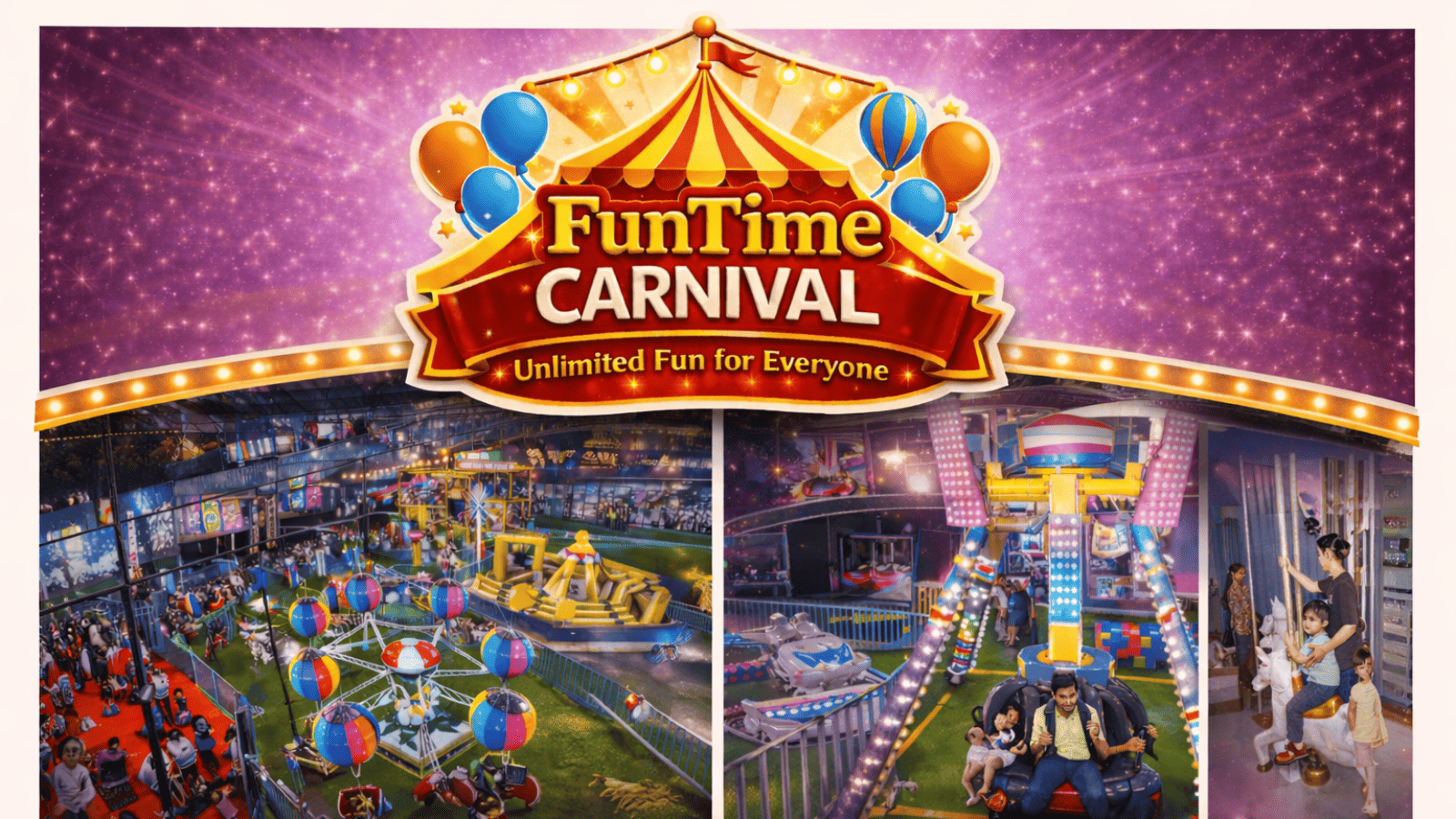 Step into a world of lights, laughter, and excitement at FunTime Carnival. This vibrant open-air carnival features a wide range of fun-filled games and rides including Airlift, Carousel, Rock Climbing, Dinosaur Ride, Bumper Cars, VR experiences, Bungee Jump, Rope Course, Cricket Challenge, and a dedicated Kids Play Area. With safe, supervised play areas, cheerful music, and a buzzing atmosphere, it’s the perfect spot for kids to play freely while parents relax. Ideal for a fun evening or weekend outing, FunTime Carnival promises joyful moments, endless giggles, and unforgettable family memories!