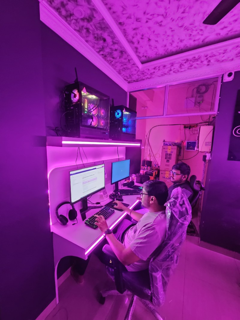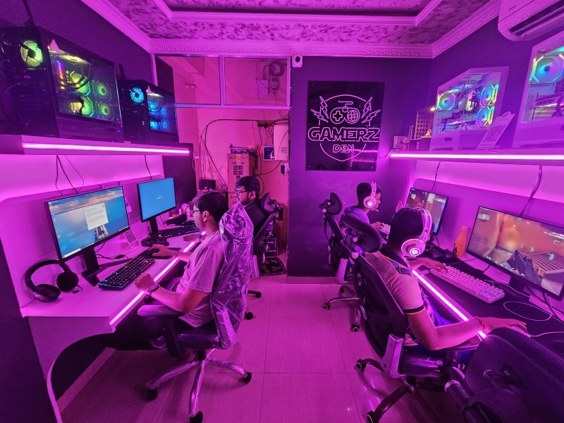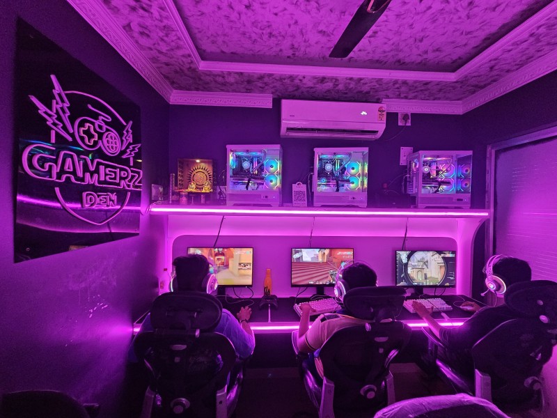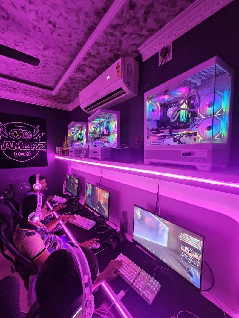 Step into Gamerz Den, a premium gaming café designed for casual players and hardcore gamers alike. Located in a fully air-conditioned space with immersive lighting and an electrifying gaming vibe, our setup features 5 high-end gaming PCs equipped with the latest hardware, ultra-smooth displays, and comfortable ergonomic chairs for long hours of uninterrupted gameplay.