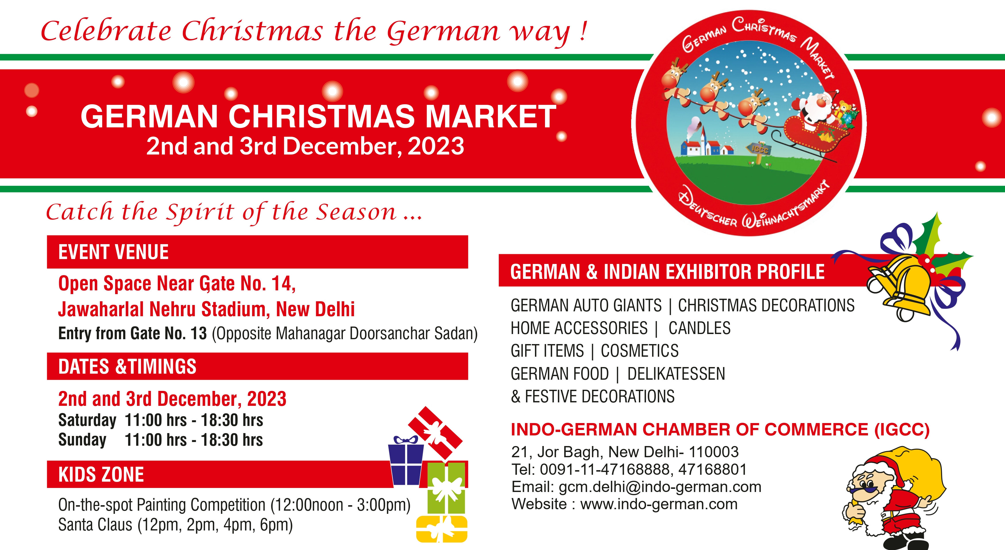 Organised by the Indo-German Chamber of Commerce (IGCC), the attractions of the event are German Bratwurst, Waffles and beverages setting the spirit of the season and Christmas along with a beautifully decorated Christmas tree, German Auto Giants, German chocolates, On-the-Spot painting competition for children, a juggling clown and of course, Santa Claus!