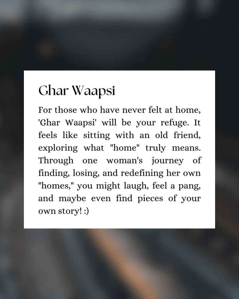 For those who have never felt at home, 'Ghar Waapsi' will be your refuge. It feels like sitting with an old friend, exploring what "home" truly means. Through one woman's journey of finding, losing, and redefining her own "homes," you might laugh, feel a pang, and maybe even find pieces of your own story! :)