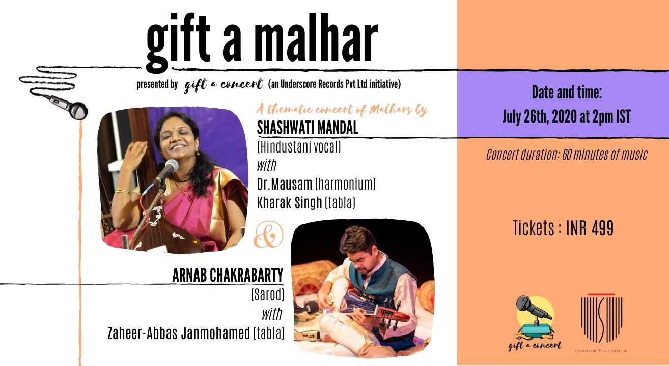 Celebrate the monsoon with Malhars, a family of raags traditionally performed during this season. This thematic concert has been curated by musicians Shubha Mudgal and Aneesh Pradhan.