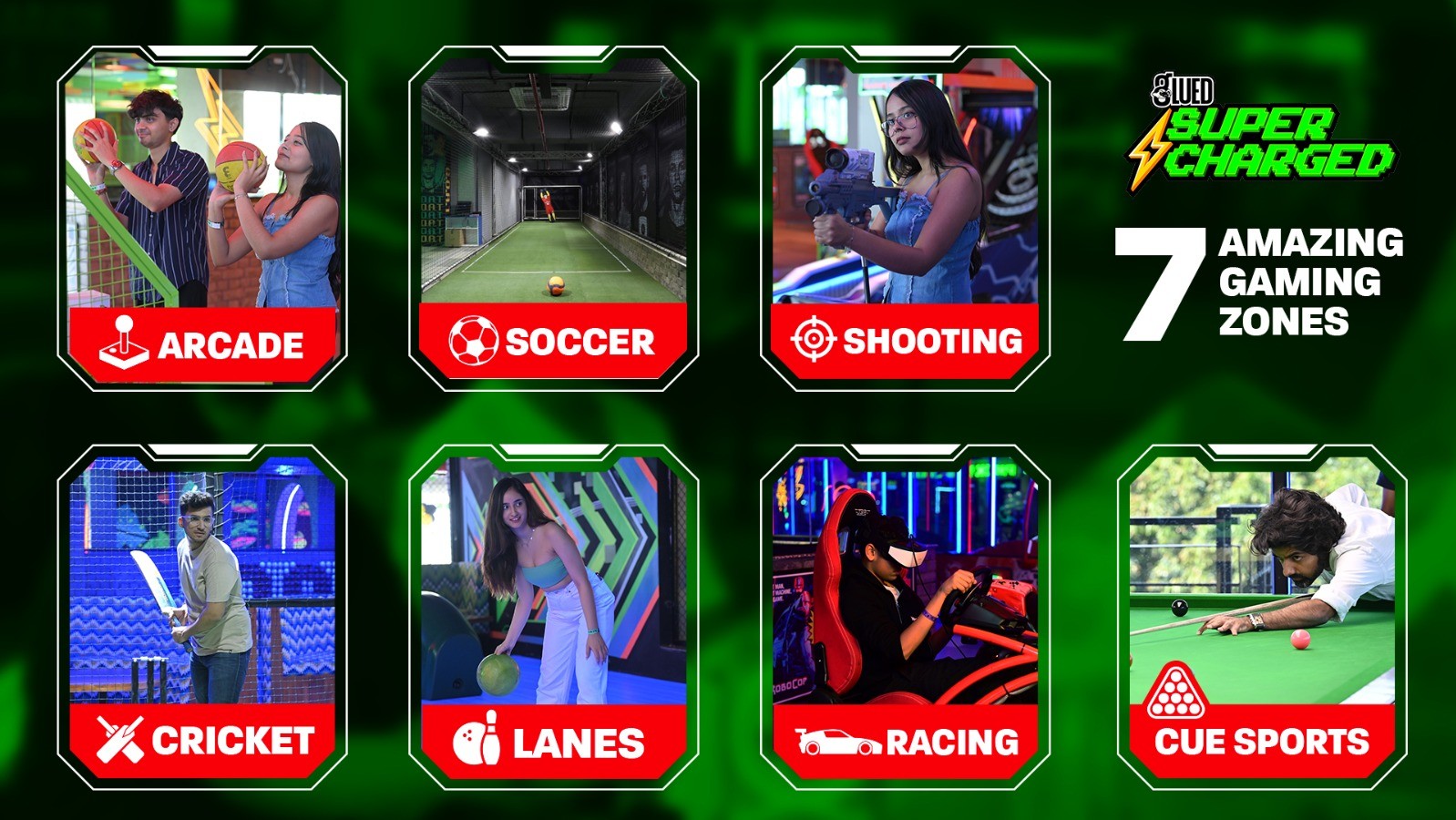 Glued Supercharged is Noida’s most expansive indoor entertainment arena, spread across 32,500 sq. ft. and designed for all-day, all-ages fun. What sets it apart is its curated blend of technology, competitive spirit, and community-driven experiences — all brought together under one roof across seven high-energy zones, each delivering its own brand of thrill: