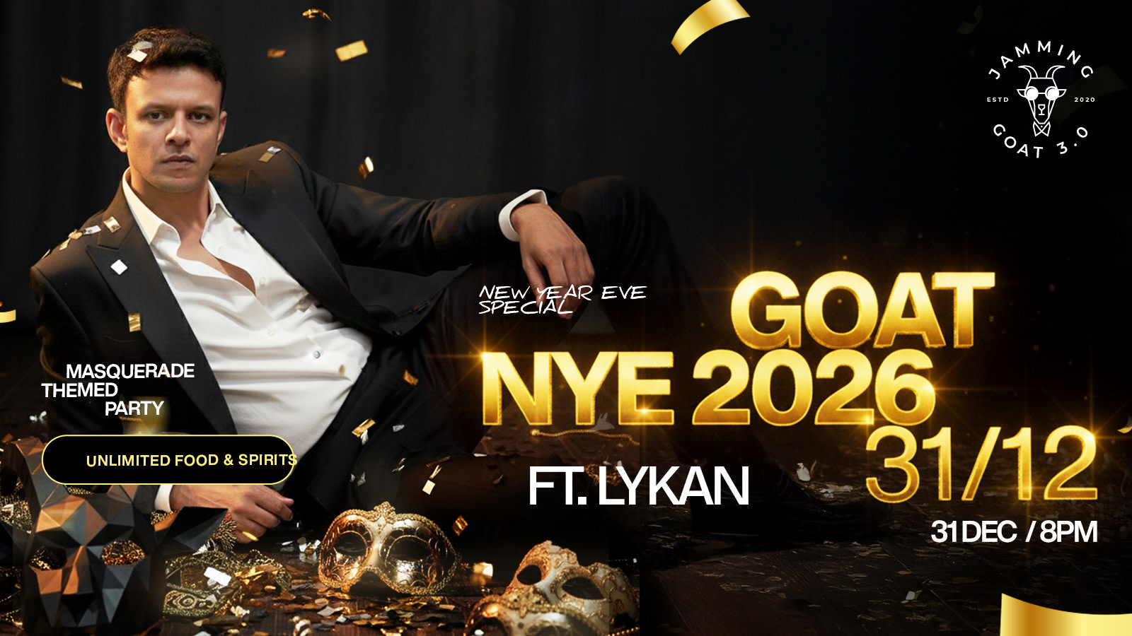 Expect a night of great music, elegant masks, premium ambience, and a lively crowd — all paired with unlimited food and spirits to keep the celebrations going till late. Dress sharp, mask up, and welcome the New Year in true GOAT fashion.