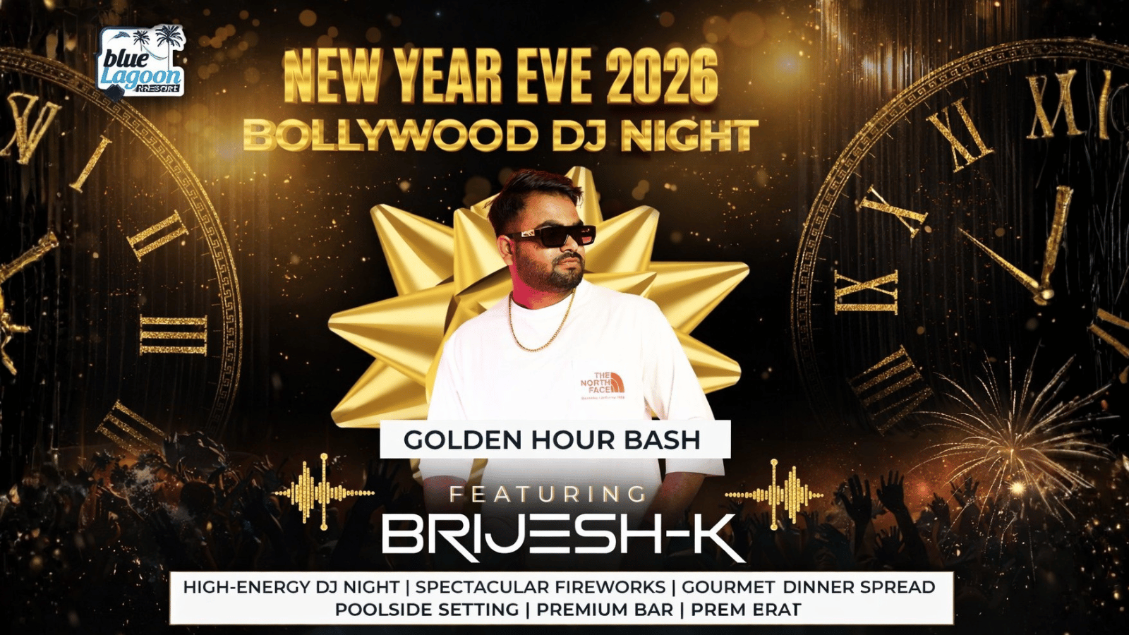 Step into 2026 with glamour, groove, and golden vibes at the Golden Hour Bash at Blue Lagoon Resort. Experience a high-octane Bollywood DJ Night as DJ Brijesh-K sets the stage on fire with chart-topping beats and party anthems. Celebrate under the stars with a stunning poolside setup, spectacular fireworks, and a lavish gourmet dinner spread, paired with a premium bar experience.