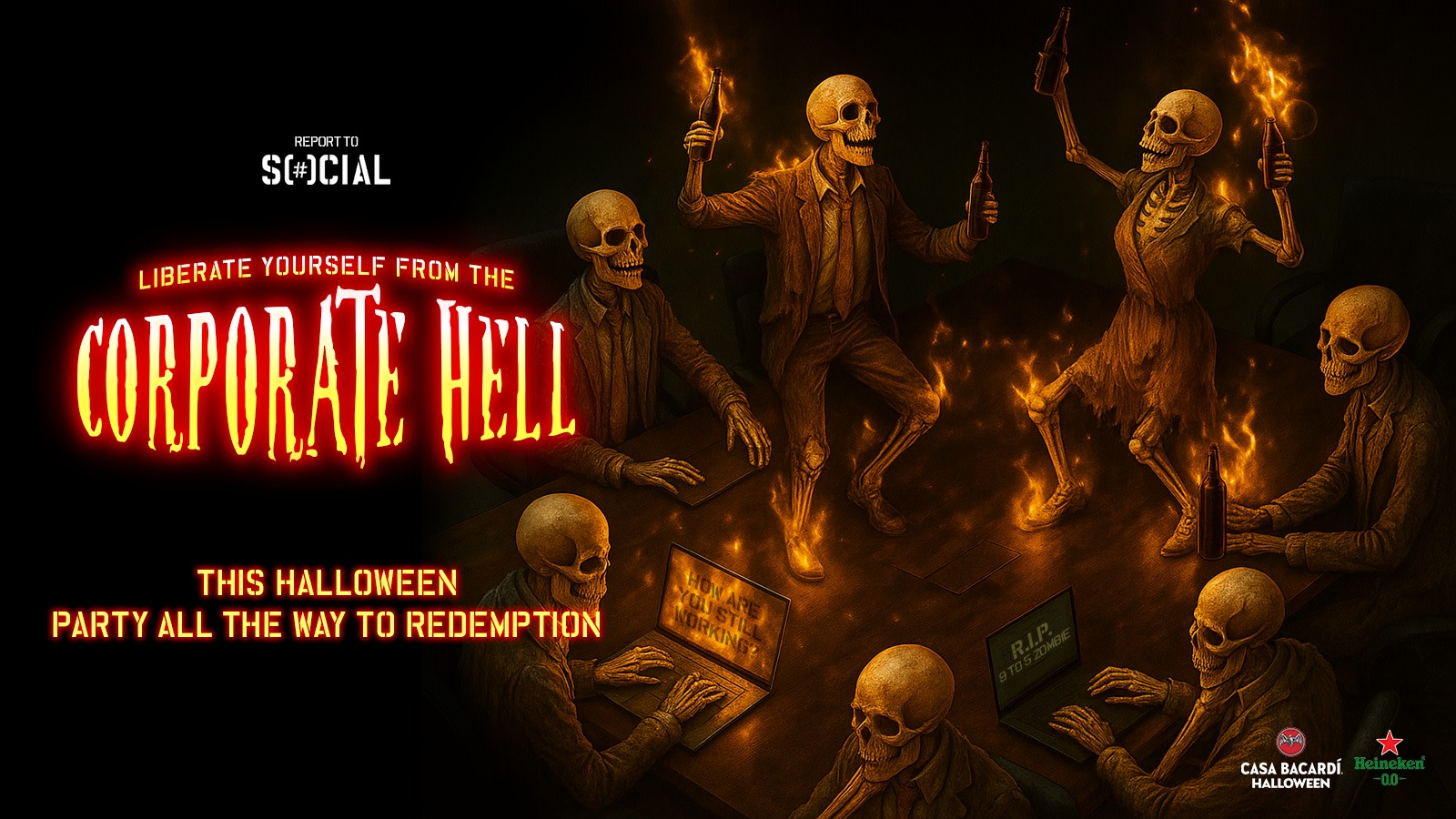 Step into Corporate Hell, an eerie office where tombstones mark missed targets, skeletons haunt from unpaid overtime, and the only KPI is killing it on the dance floor.