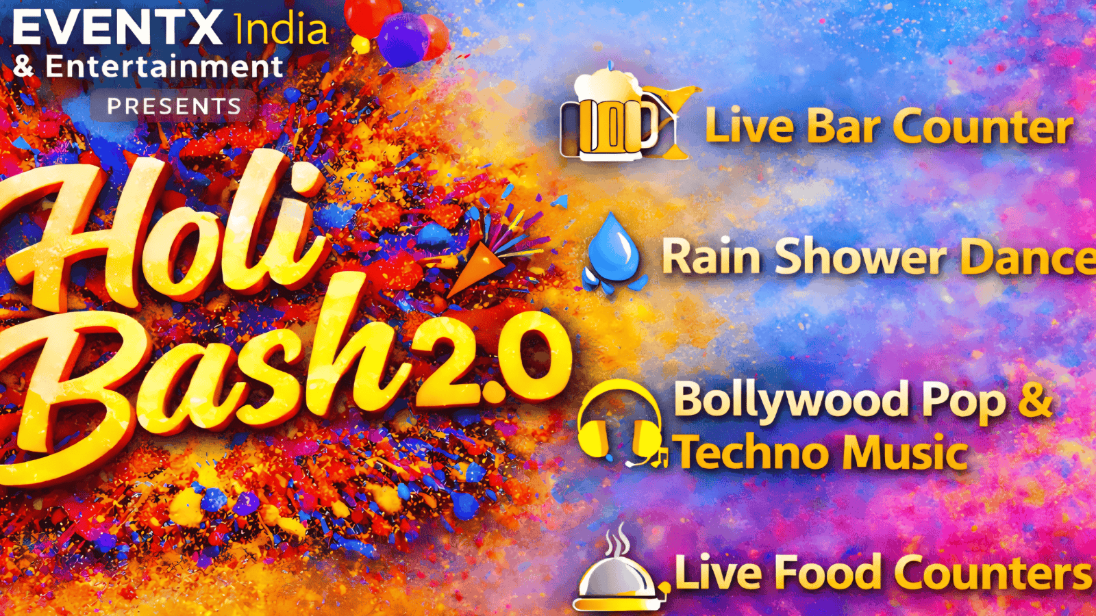 HOLI BASH 2.0 by EventX India & Entertainment is bringing you a full day of colors, music, dance, and unforgettable vibes at the stunning Hrutvi Palms, Madh Island on 3rd March.