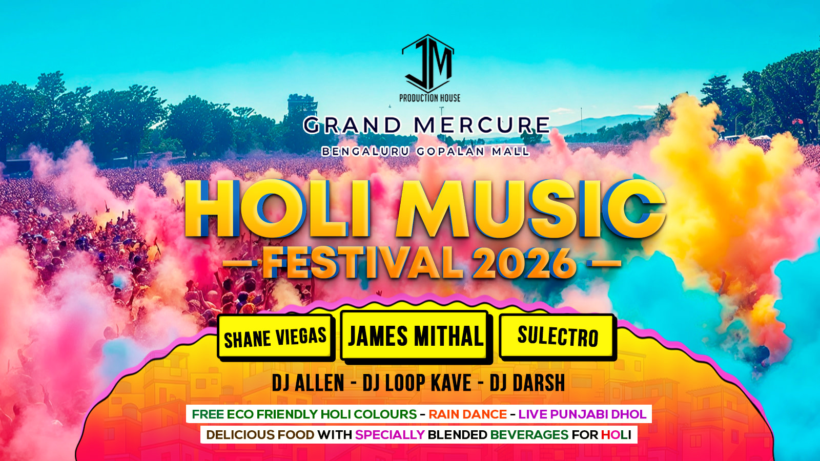 Get ready, Bengaluru! The most electrifying Holi celebration of the year is here! Experience a day filled with vibrant colours, high-octane music, rain dance madness, and unforgettable festive vibes at the Holi Music Festival 2026.