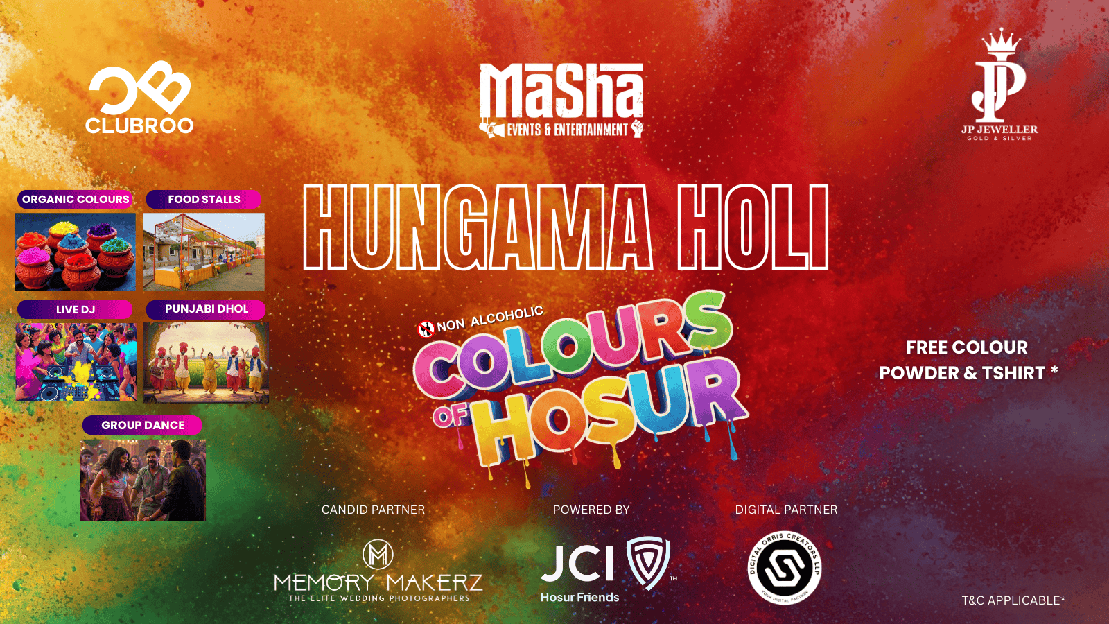 Enjoy organic colours for a safe and joyful celebration, along with exciting dance performances that add to the festive vibe. A lively food stall zone will be available to keep you refreshed while you celebrate with your friends and family.