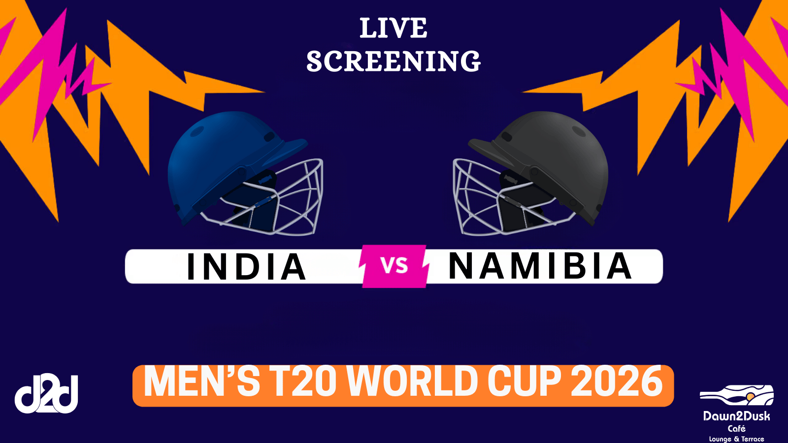 Gear up for an exciting T20 World Cup encounter as India takes on Namibia, streaming LIVE at Dawn2dusk Café — the biggest rooftop café with the largest screen experience in town.