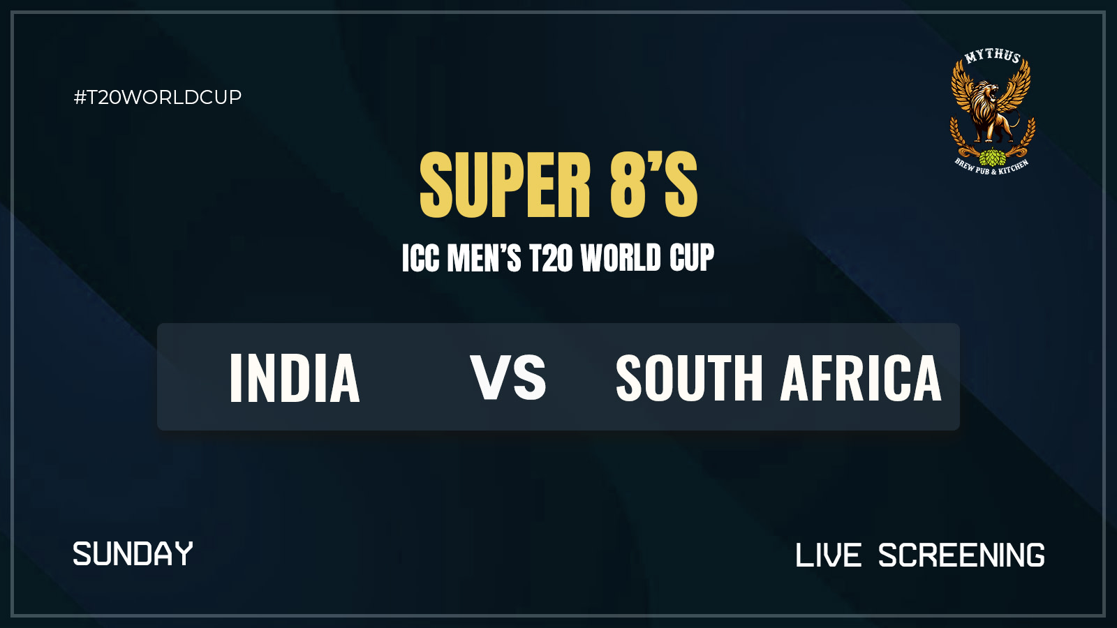 Cricket fever hits its peak as India faces South Africa in a thrilling Super 8's World Cup showdown live on the big screen. Watch every explosive boundary and game-changing wicket in an atmosphere buzzing with passion and pride. Gather your squad, wear your team colors, and be part of a crowd that roars with every run scored. Indulge in delicious bites and refreshing drinks while the action unfolds in high-definition glory.