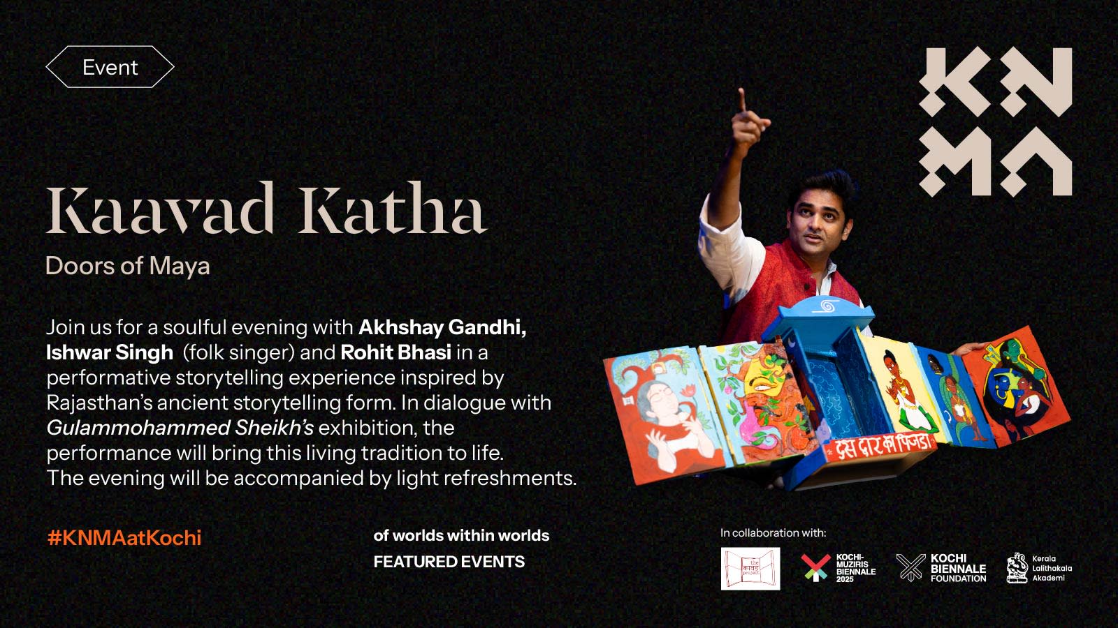 This performance draws upon the philosophical idea of Maya, the shifting and layered nature of reality, to reimagine the Kaavad as a contemporary storytelling device. As each door opens, worlds overlap myth and memory, history and imagination, the sacred and the everyday. The audience is invited to move through these thresholds, encountering stories that reveal how narratives travel across time and space.
