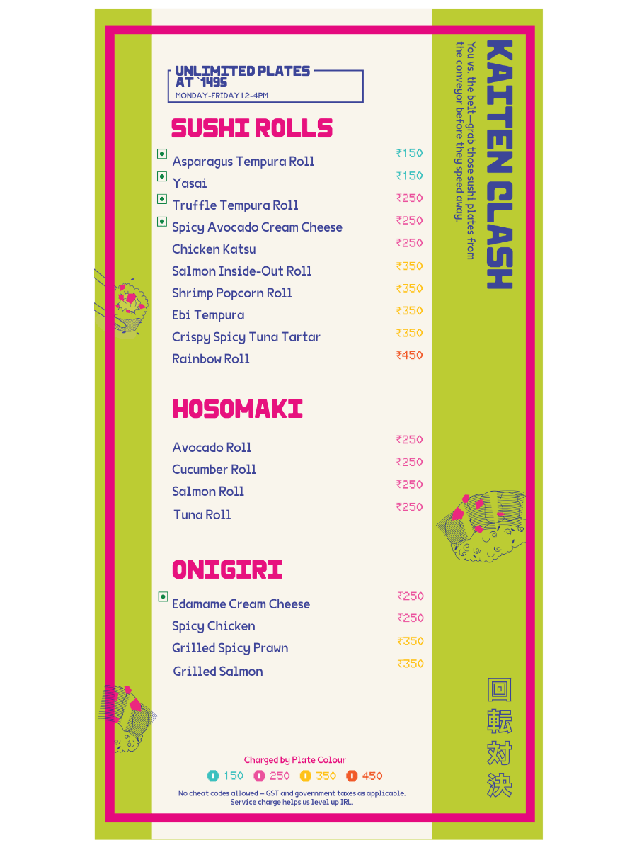 The conveyor belt is live, plates are in motion, and the only rule is simple: grab fast, eat faster. Freshly rolled sushi circles the table nonstop, turning every seat into the front row of a flavour arena. No menus. No pauses. Just pure kaiten chaos.