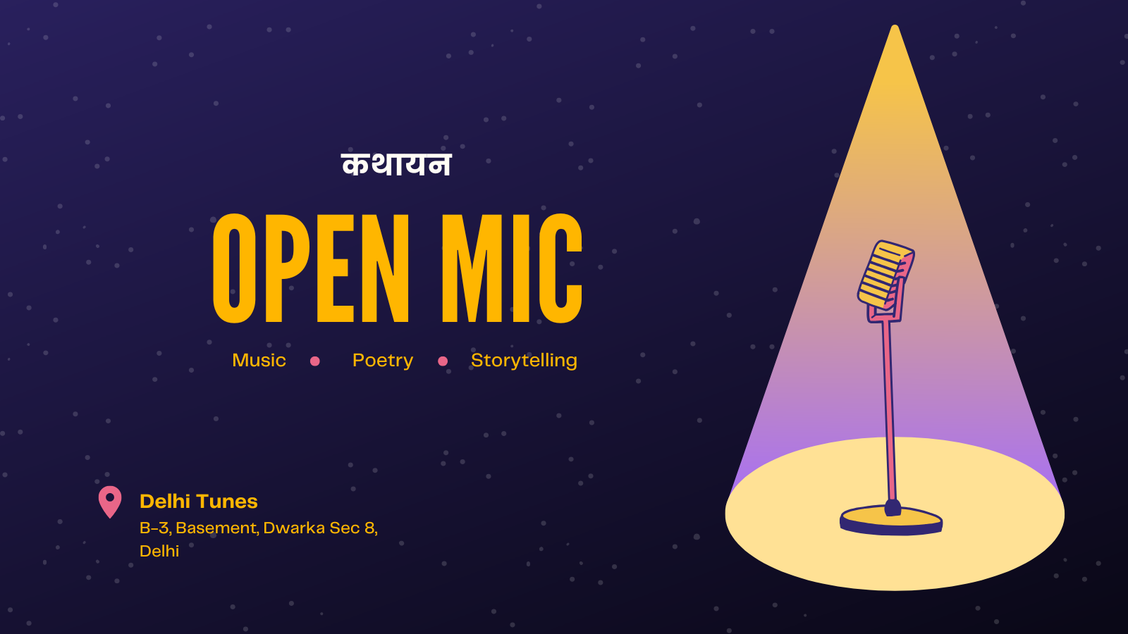 Delhi Tunes brings you a weekly Poetry & Storytelling Open Mic in Dwarka, every Saturday - an open, welcoming stage for expression, connection, and creativity.