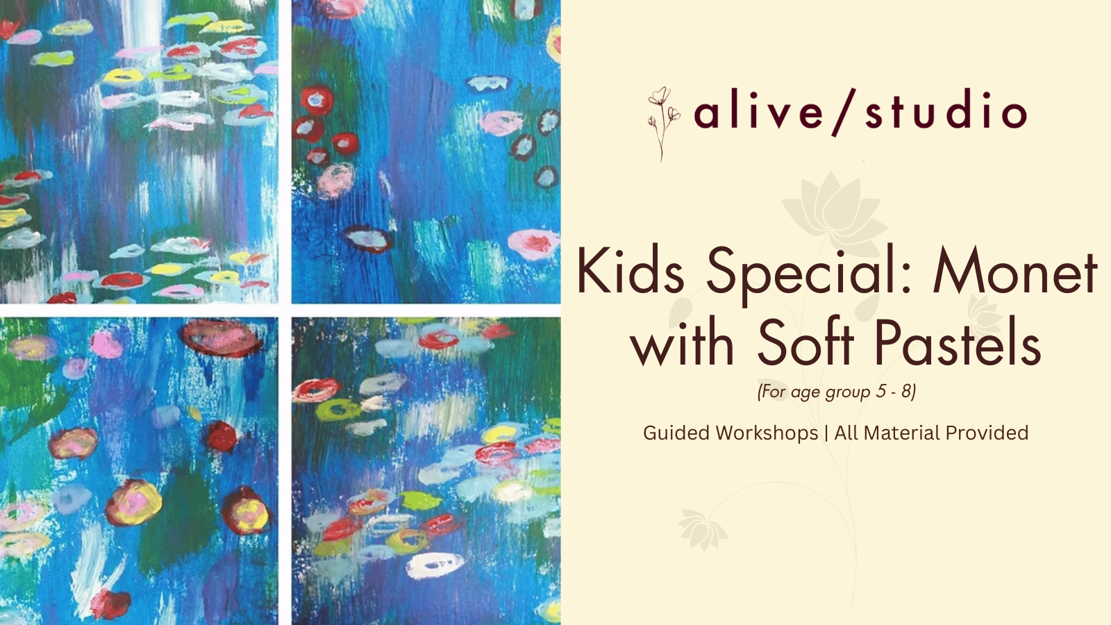 Inspired by the beautiful landscapes of Claude Monet, this workshop introduces kids to the soft, expressive style of Impressionist art. Children will create their own Monet-inspired artwork on A4 paper using soft pastels, exploring how colours, light, and textures come together to form dreamy landscapes.