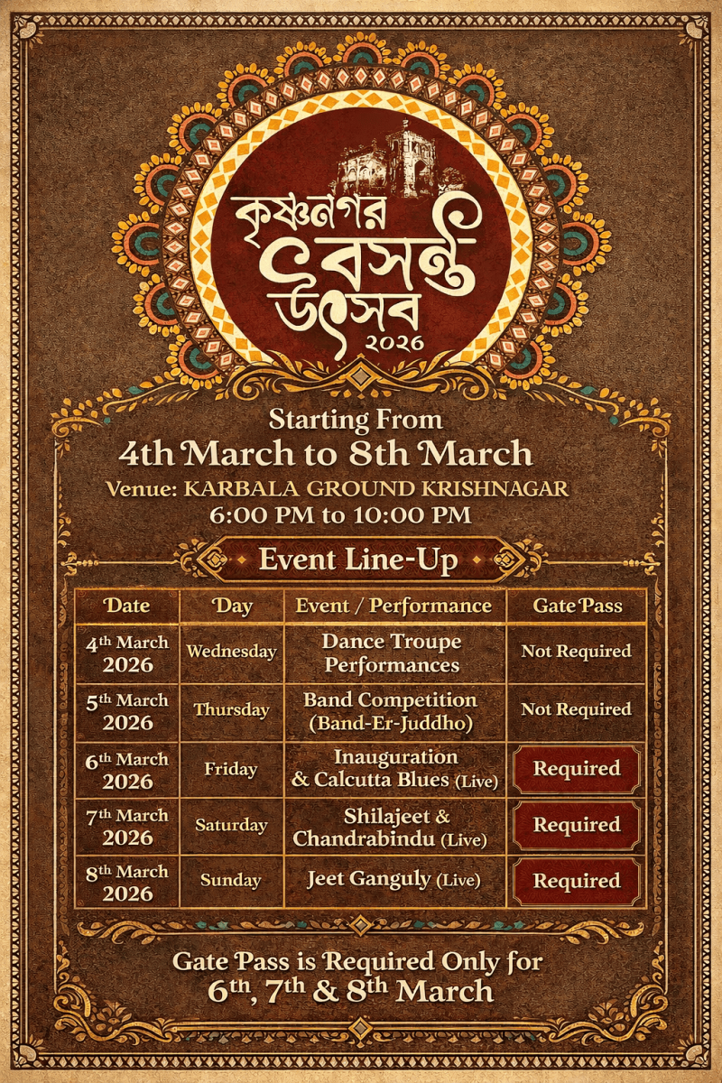 Krishnagar Basanta Utsav 2026 returns with vibrant energy and musical celebration as it steps into its 6th glorious year. Building on the success and love of the past five years, this year’s Basanta Utsav promises to be bigger, richer, and more exciting, while keeping the soul of the festival just the way our audience loves it.