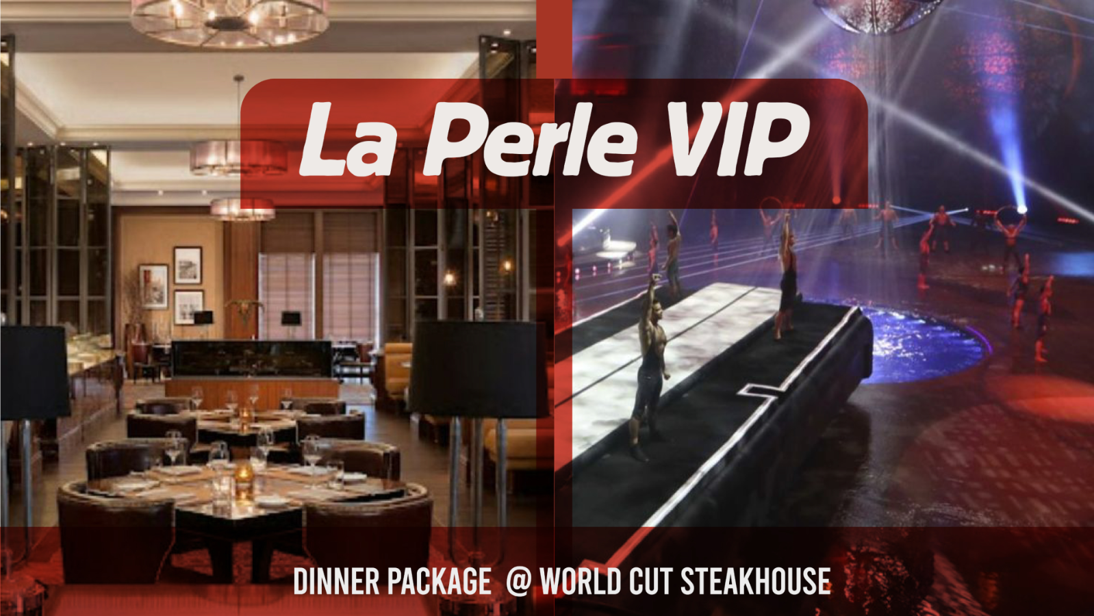 Enjoy a Set menu at Worldcut Steakhouse Restaurant with the VIP treatment with this dinner package. Luxury in the heart of the theatre. As a VIP, you'll be able to enter through our exclusive VIP lounge area, where you can hang out pre-show and have complimentary savoury and sweet snacks, candy, and beverages. Once in the theatre, VIPs will be able to enjoy the show with great views and larger seats. Dinner timing: Please specify your restaurant choice at time of booking. The reservations will be made automatically at the selected restaurant as per the below timings: 8:00 pm for the 6:30 pm shows 7:00 pm for the 9:00 pm shows La Perle by Dragone is the regions first permanent show, located in the heart of Dubai at Al Habtoor City and brought to Dubai by Al Habtoor Group. The show was created by legendary Artistic Director, Franco Dragone, famed for his work including Le Rêve in Las Vegas and The House of Dancing Water in Macau.