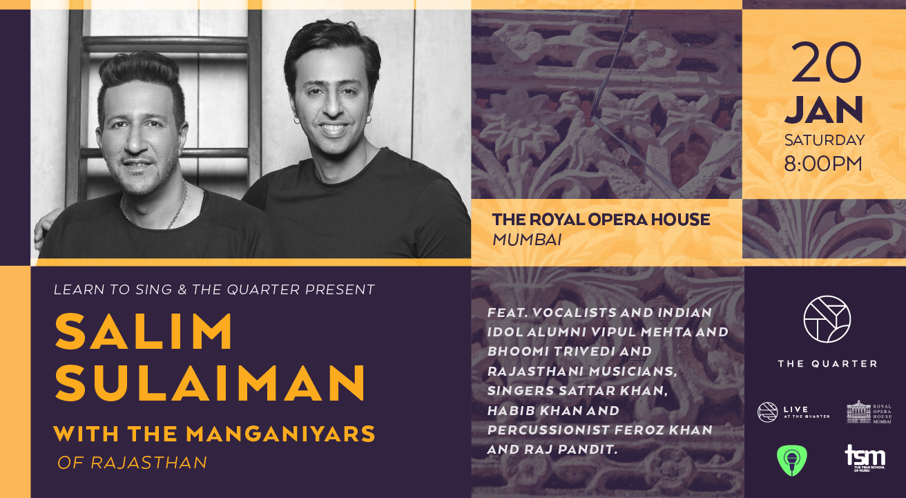 Hindi film music composers Salim and Sulaiman Merchant will bring to Mumbai for the first time a show they’ve recently toured around the world, with an ensemble featuring vocalists and Indian Idol alumni Vipul Mehta and Bhoomi Trivedi and Rajasthani musicians, singers Sattar Khan and Habib Khan and percussionist Feroz Khan. In this career-spinning concert, presented by The Quarter at the Royal Opera House, Salim-Sulaiman will present their biggest Bollywood hits interspersed with qawwali classics and popular Rajasthani folk tunes. Expect a set filled with highlights such as their rousing rendition ‘Allah Hoo’ and a medley of the popular tracks ‘Yeh Honsla’ and ‘Kesariya Balam’.