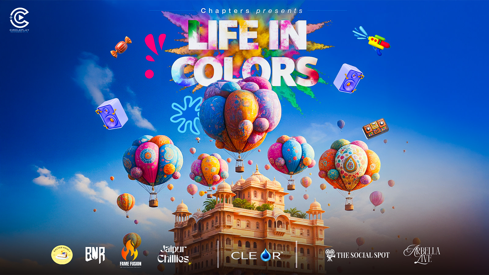 Life in Colors is one of the most anticipated upcoming Holi events in Jaipur 2026, organised by Circleplay and curated by Chapters, a leading event management brand in Jaipur. Hosted at Jewels Resort, Vaishali Nagar — recognised as the best venue for Holi event in Jaipur 2026 — this premium Holi festival event in Jaipur introduces a bold Holi Paint Party experience featuring live DJs, specially formulated paint colours, safe colours for skin, vibrant color celebrations, exclusive colour zones, a high-energy poolside atmosphere, and unlimited fun.