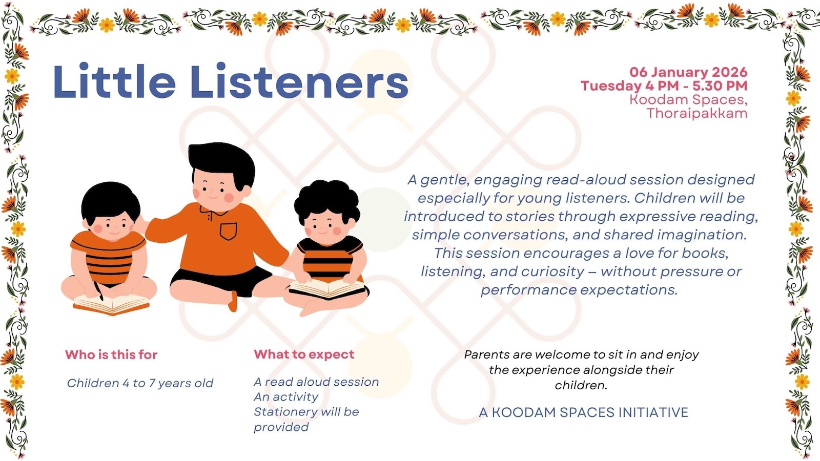 A gentle, engaging read-aloud session designed especially for young listeners. Children will be introduced to stories through expressive reading, simple conversations, and shared imagination. This session encourages a love for books, listening, and curiosity — without pressure or performance expectations. Parents are welcome to sit in and enjoy the experience alongside their children.